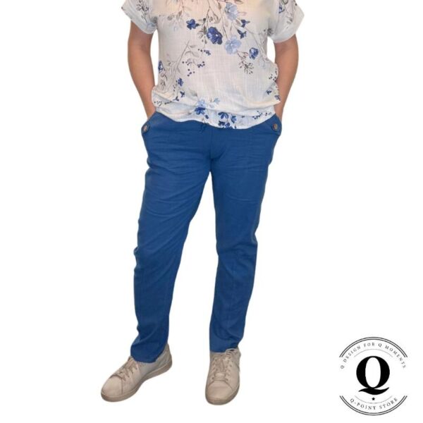 Rennot ja monikäyttöiset Warwick-housut saksalaiselta Lea H. -merkiltä ovat kesän varma valinta. Pirteä sininen sävy tuo asuun raikkautta ja tekee housuista helposti yhdisteltävän moniin eri tyyleihin.