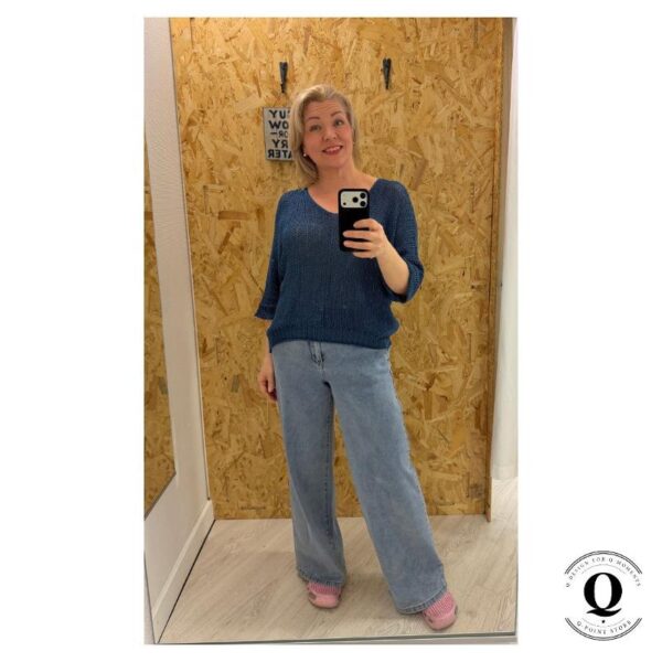Neule on yhden koon iso silmukkainen neule, malliltaan löysä ja hihat ovat vajaa mittaiset ja helma takaa hieman etuosaa pidempi. Neule kuultaa läpi, joten alle voit pukea topin, puseron tai rohkeampi pukeutuja väriin sopivat liivit.
